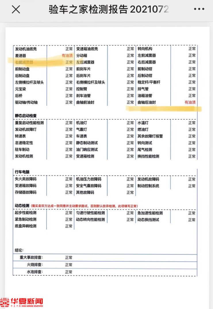 检测结果显示差速器和曲轴后油封“有油渍”。