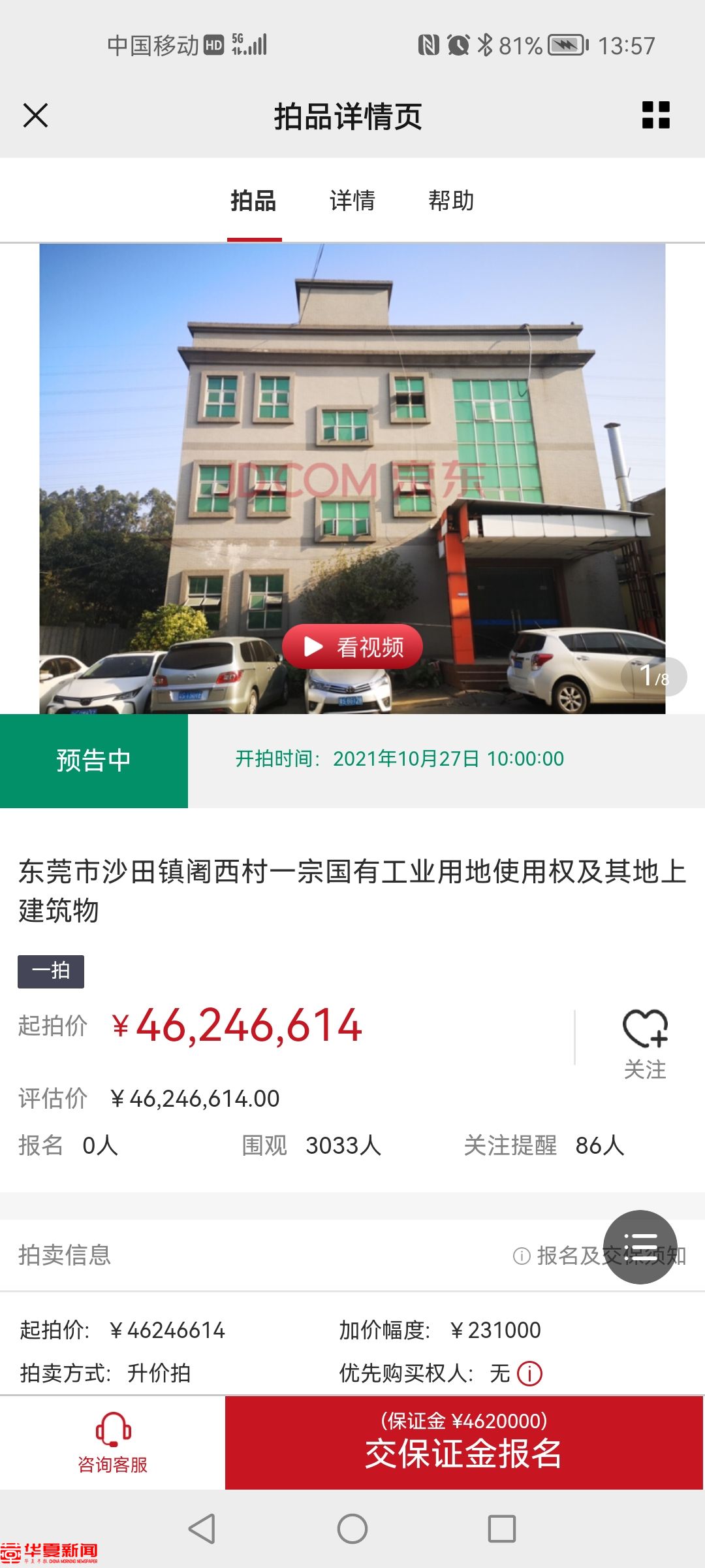 东莞市第一人民法院京东网络司法拍卖平台公布的拍卖公告显示,拍卖的是位于东莞市沙田镇阇西村百亩小组深树公一宗国有建设用地使用权及其地上建筑物。起拍价为46246614元,保证金为4620000元,增价幅度为231000元(或其倍数)。