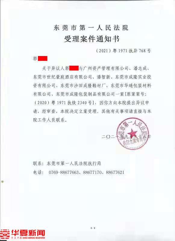 华夏早报-灯塔新闻了解到,早在10月27日这次拍卖之前,郭某某就向东莞市第一人民法院再次提交了异议申请,这回被受理了。2021年9月26日,东莞市第一人民法院出具了受理案件通知书,该通知书称,经审查,本院决定立案受理,其他有关事项请直接与本院工作人员联系。