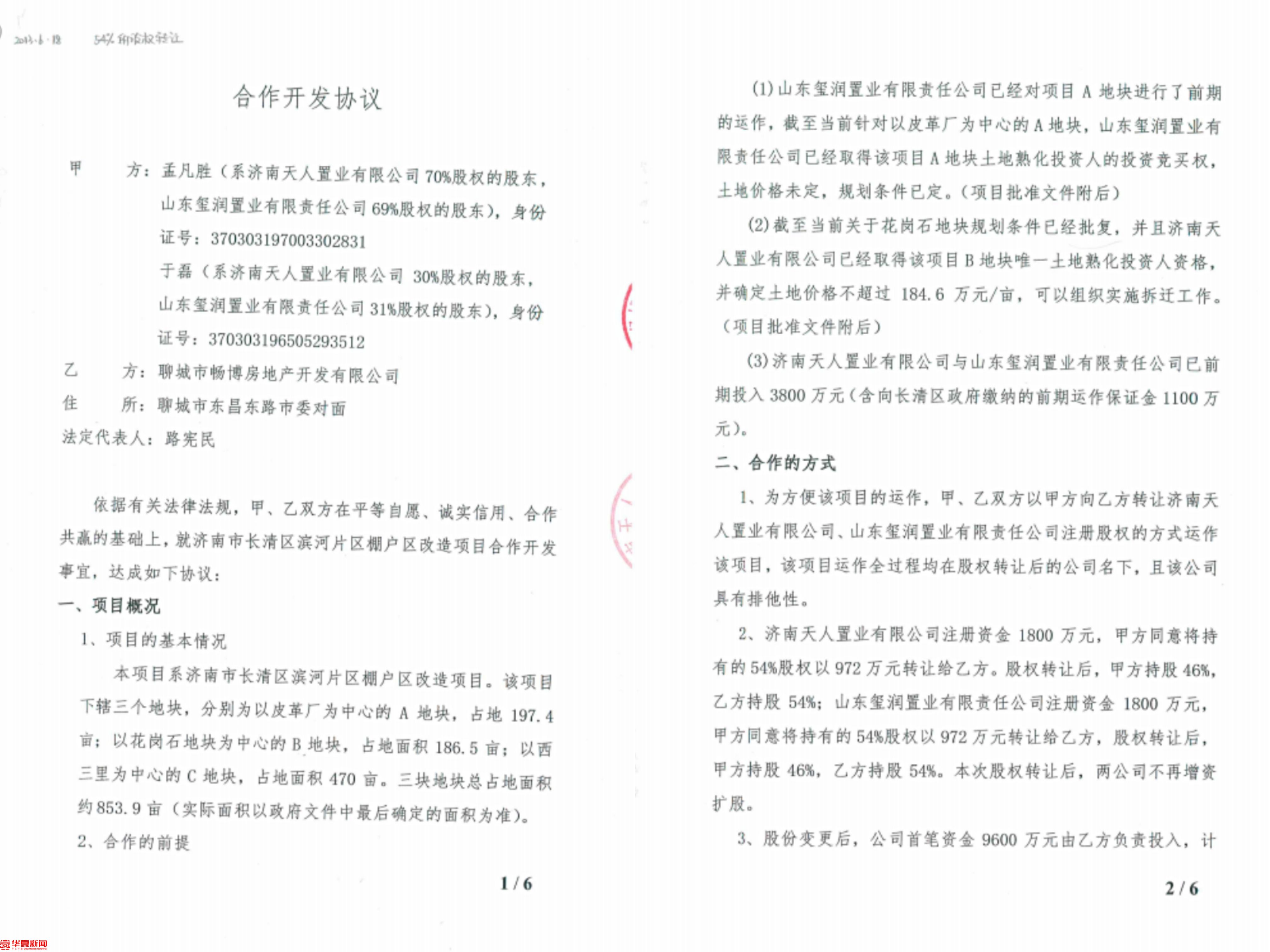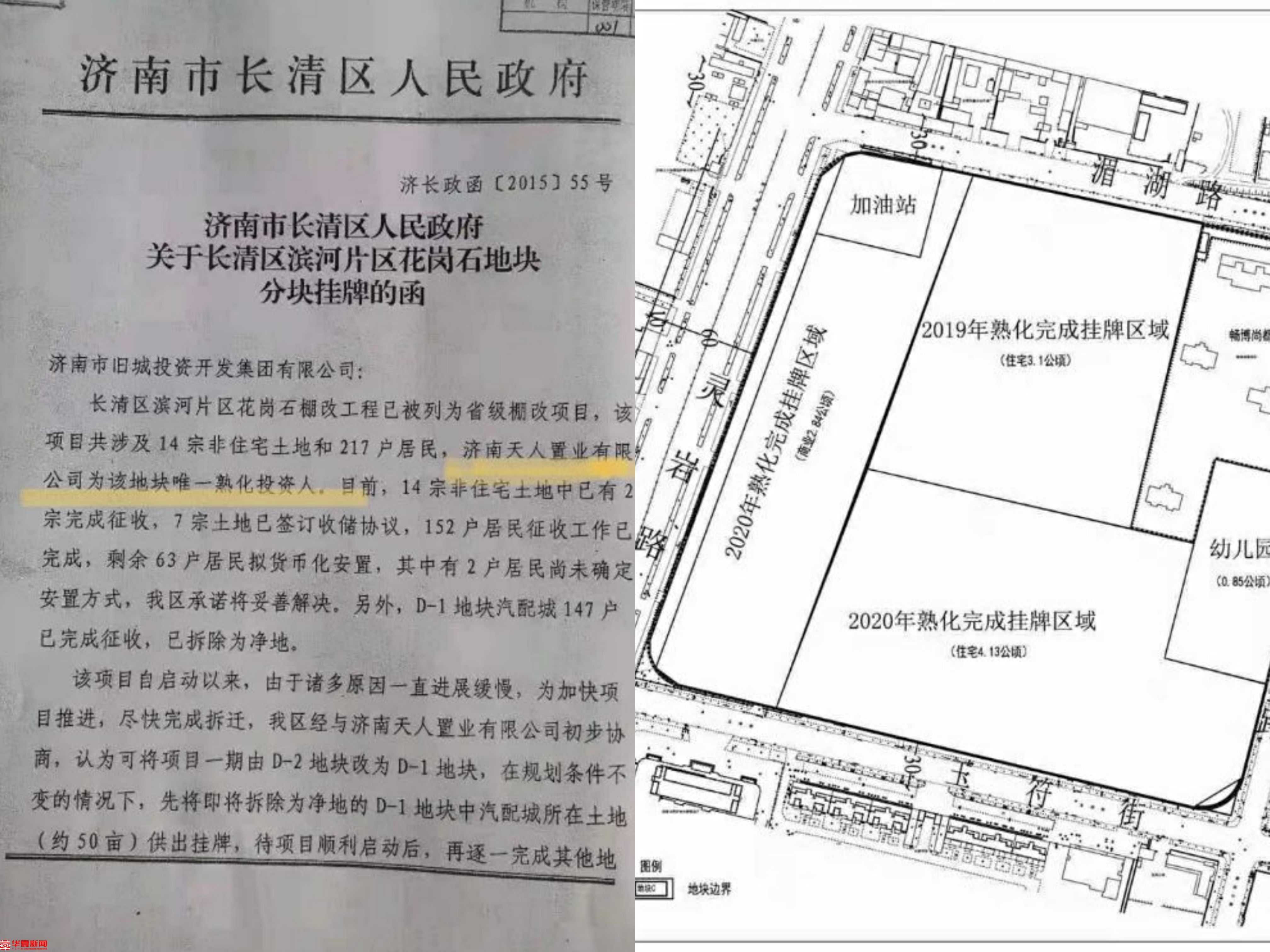 华夏早报-灯塔新闻调查发现,济南天人置业有限公司作为乙方于2013年4月18日与甲方济南市长清区人民政府签订的《长清区花岗石地块项目协议》显示,花岗石地块属于棚户区改造项目,规划总用地面积238.05亩,按规划分为C、D-1、D-2、X2四个地块,享受棚户区改造优惠政策。协议确定济南天人置业有限公司为花岗石地块唯一土地熟化投资人。协议最后有甲乙双方的公章以及各自法定代表人(代理人)的签名、印章。