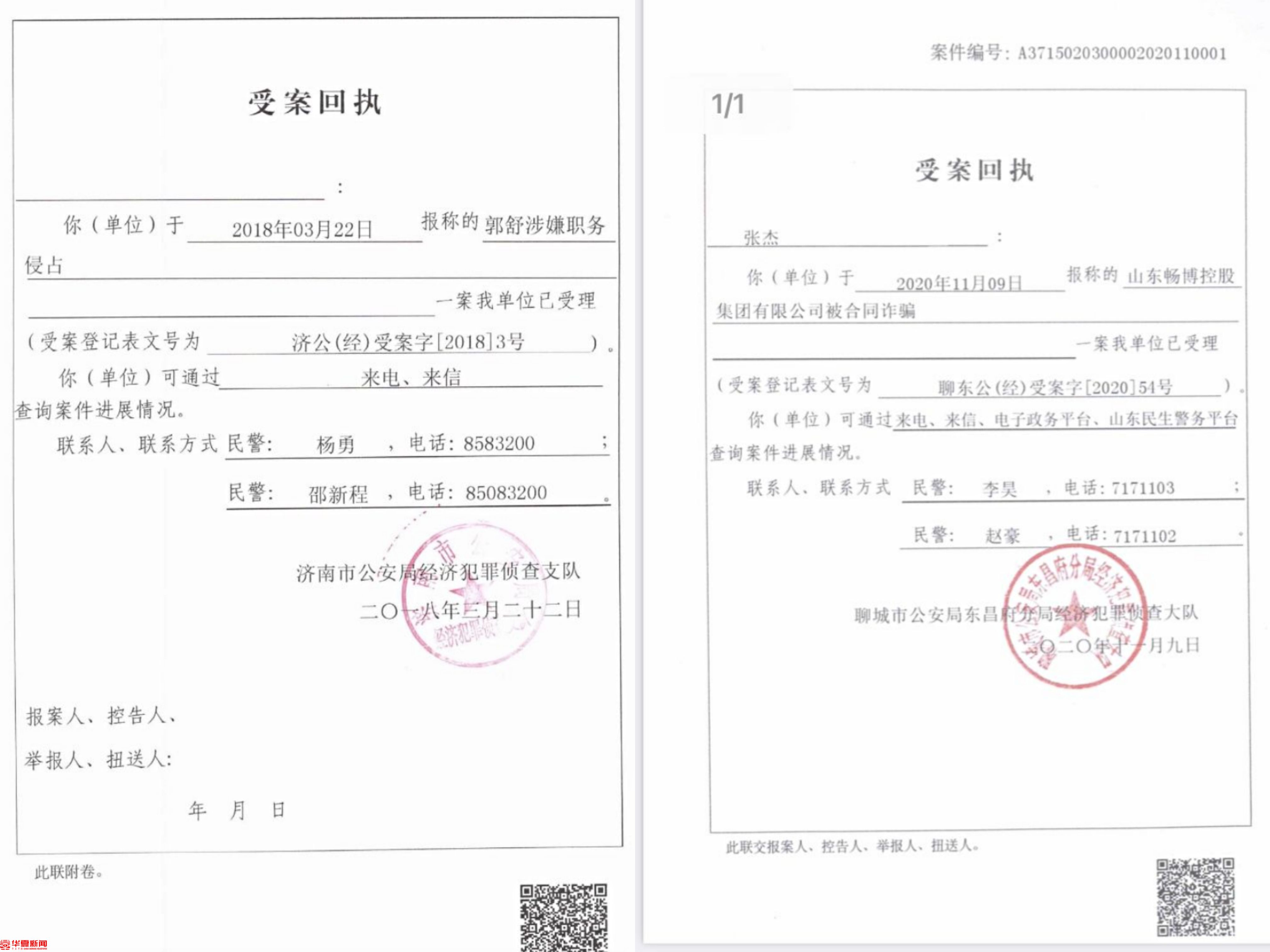 作为济南市公安局关于郭舒涉嫌职务侵占的立案告知书。右为聊城警方关于郭舒涉嫌合同诈骗的立案告知书。