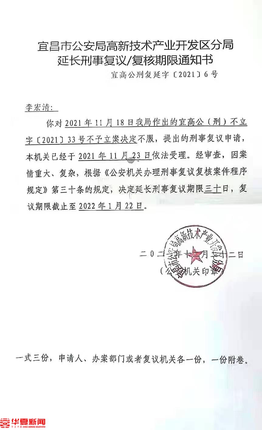 据悉,2021年1月15日,众债权人向宜昌市公安局高新区分局报案,控告闵连坤涉嫌集资诈骗、非法吸收公众存款。2021年11月18日,该局以“没有犯罪事实”为由决定不予立案。报案人不服,提出刑事复议申请并被受理。2021年12月22日,宜昌市公安局高新区分局回复称,“经审查,因案情重大、复杂”“决定延长刑事复议期限三十日,复议期限截止至2022年1月22日”。