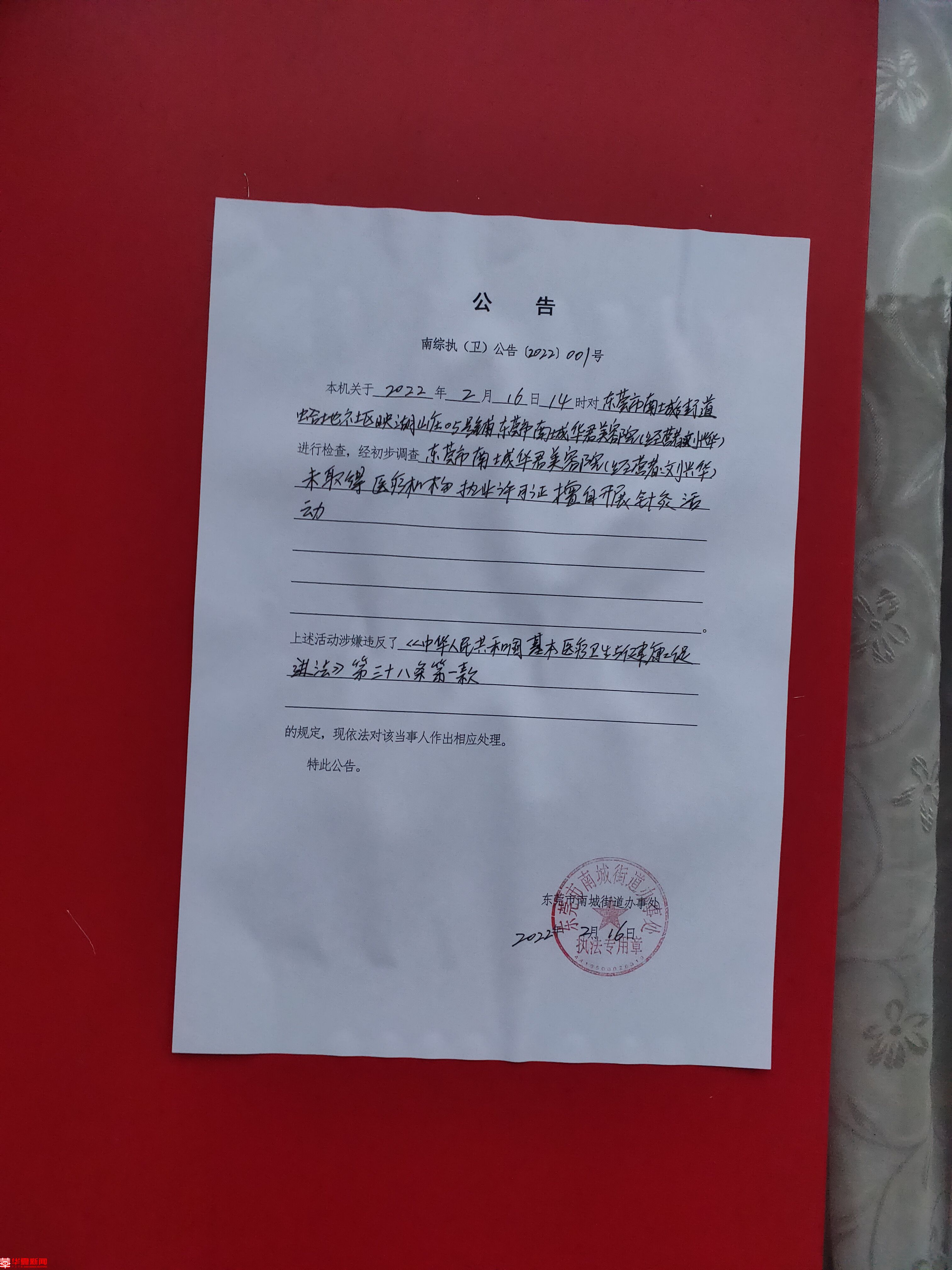 东莞市南城街道办事处于2月16日张贴在涉案美容院门口的《公告》显示,“东莞市南城华君美容院(经营者刘兴华)未取得医疗机构执业许可证擅自开展针灸活动”,“涉嫌违反了《中华人民共和国基本医疗卫生与健康促进法》第三十八条第一款的规定,现依法对该当事人作出相应处理。”但“相应处理”如何处理,《公告》中并未明确。
