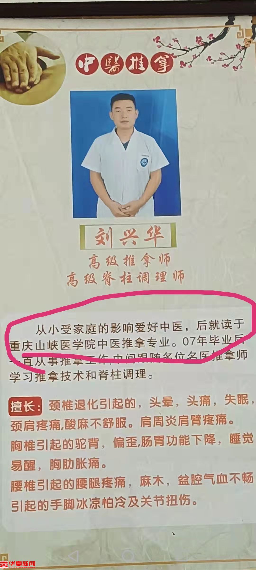 另外,投诉人还向媒体反映刘兴华对外宣传的学历涉嫌造假。投诉人提供的张贴在华君美容院墙上的宣传展板显示,刘兴华“就读于重庆山峡医学院中医推拿专业”。