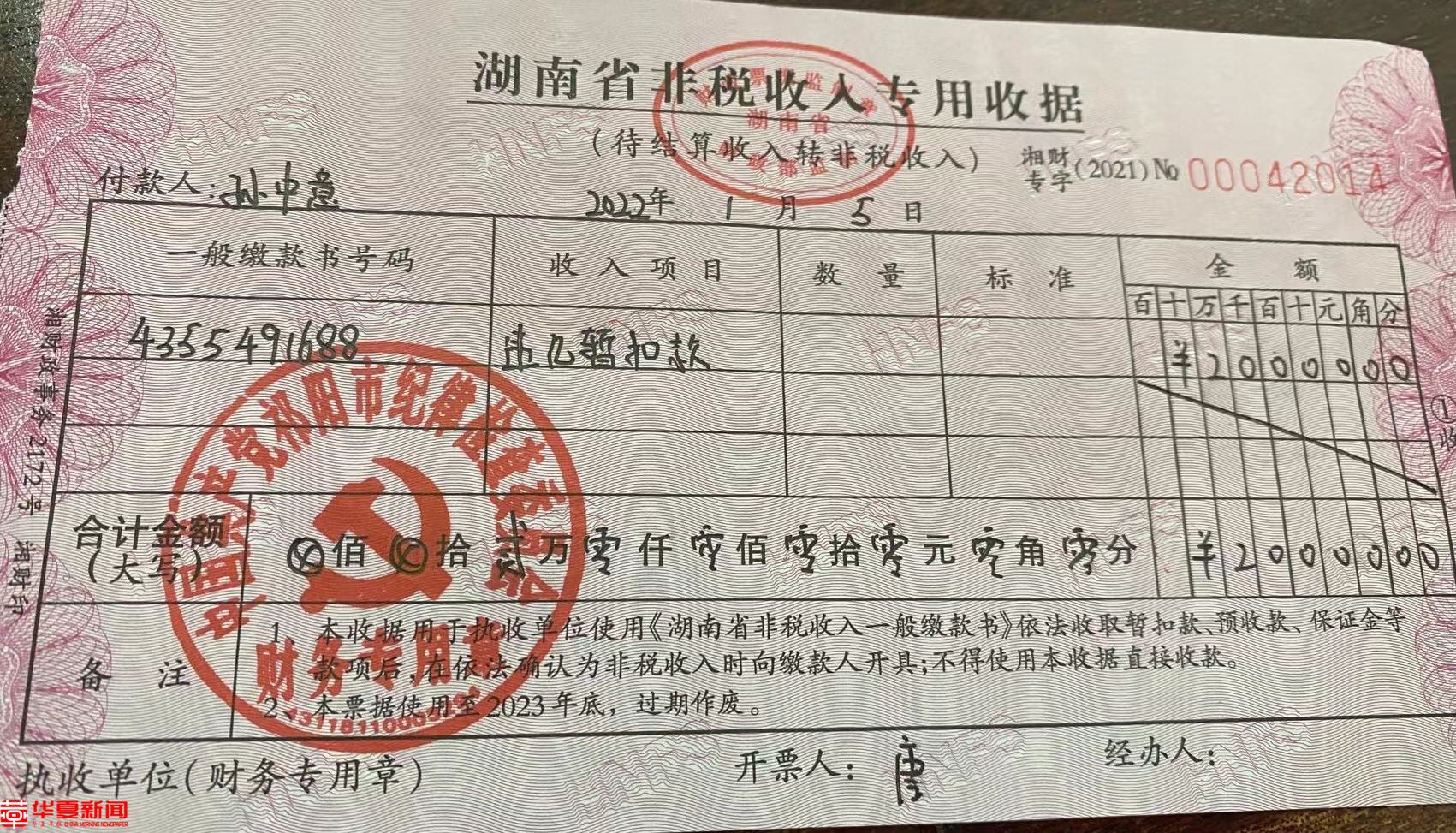祁阳市纪委开给“中间人”孙中意的违纪暂扣款收据。