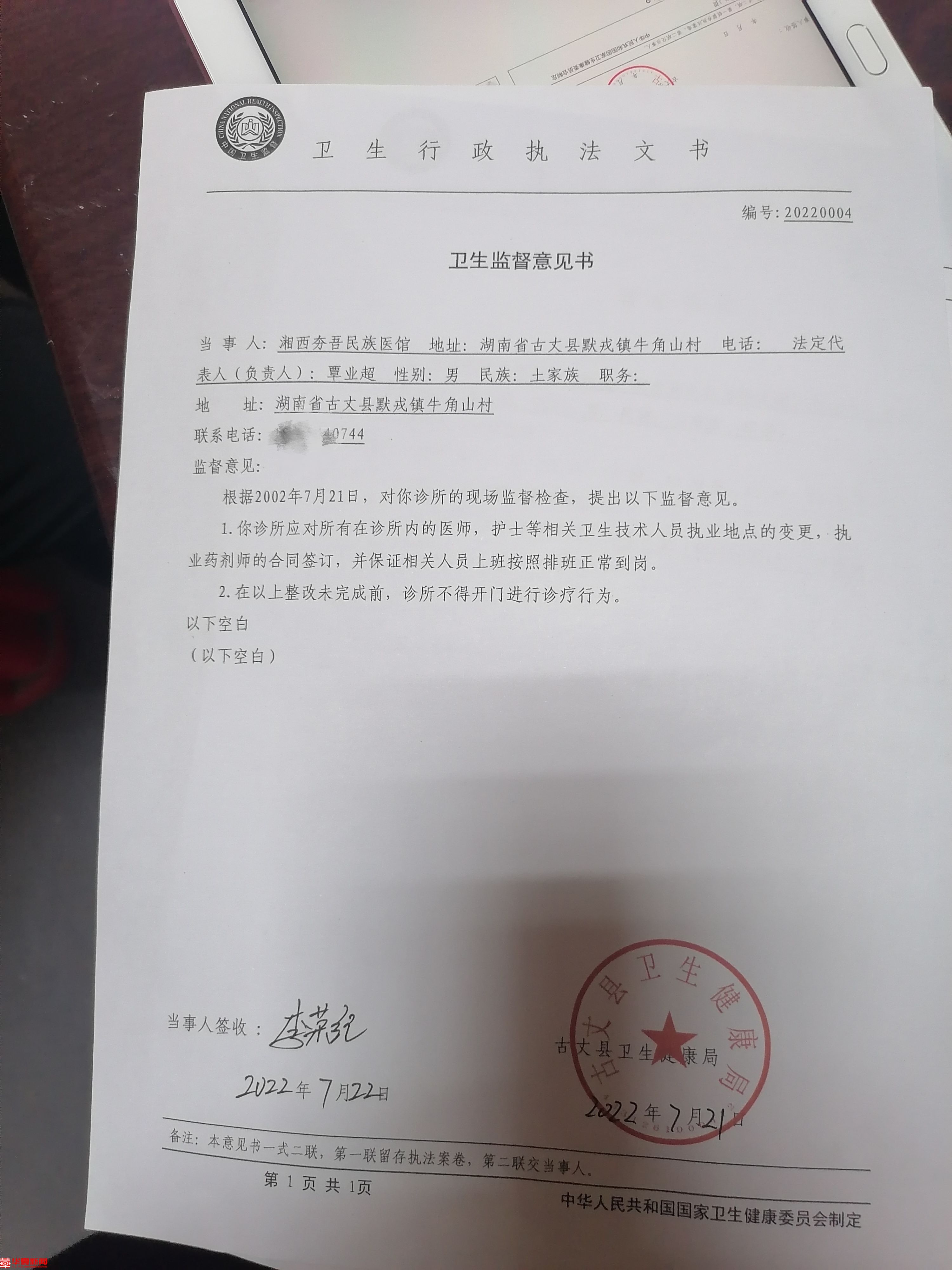 古丈县卫生健康局7月21日下发的卫生行政执法文书。