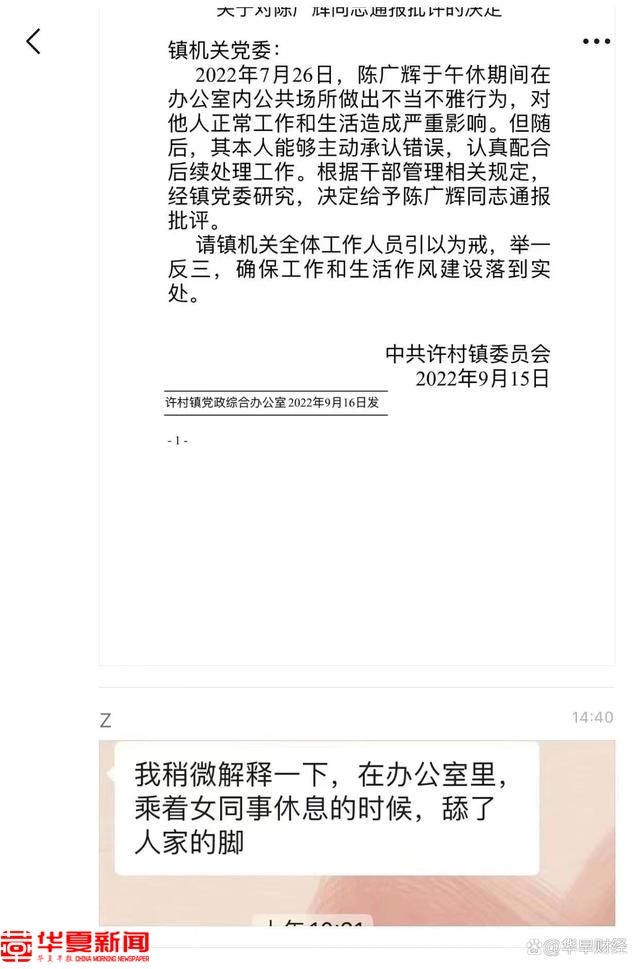华夏早报讯(灯塔新闻记者 张喆)近日,网传一镇政府干部午休期间在办公室舔女同事脚,被镇党委通报处理。