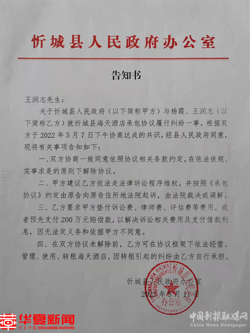 2022年5月11日,忻城县政府给王润志的《告知书》称:乙方(王润志)可在承包协议的框架下依法经营、转租;同年5月20日的县政府信访局《关于王润志信访事项的答复意见书》显示:“您向忻城县政府申请解除承包协议并支付补偿金2650万元,虽经双方多次协商,但因就解除协议支付金额无法达成一致,忻城县政府建议并同意您作为原告向相关法院提起诉讼,由法院依法判决或调解此事”。