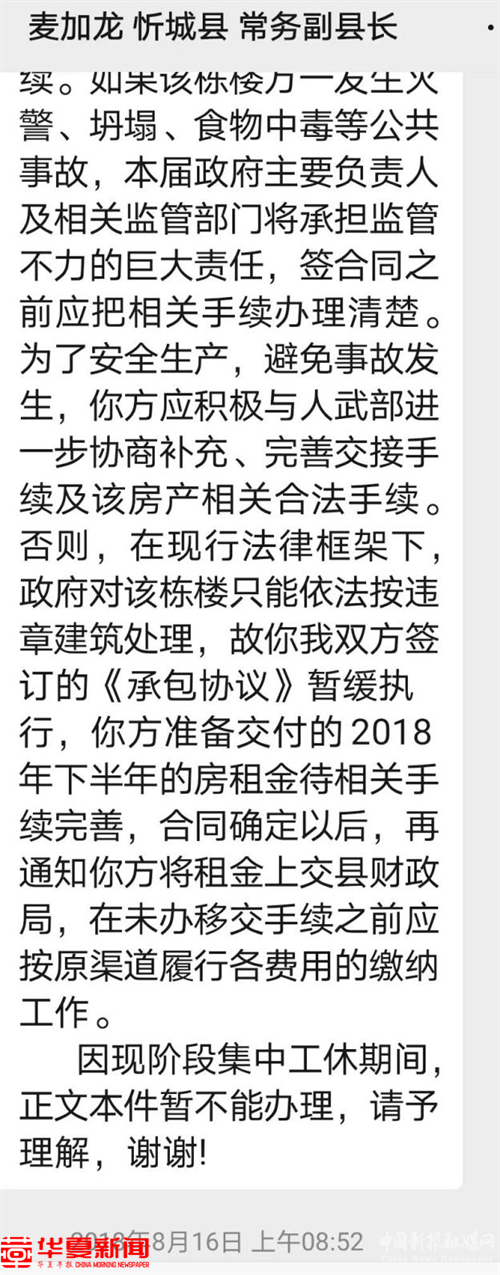 2018年8月16日,忻城县政府副县长麦加龙微信通知王润志称该栋楼房产证等手续不齐全,与政府签订的合同暂缓执行,需由王润志和忻城县人武部进行沟通完善相关手续且2018年下半年的房租暂缓上缴。