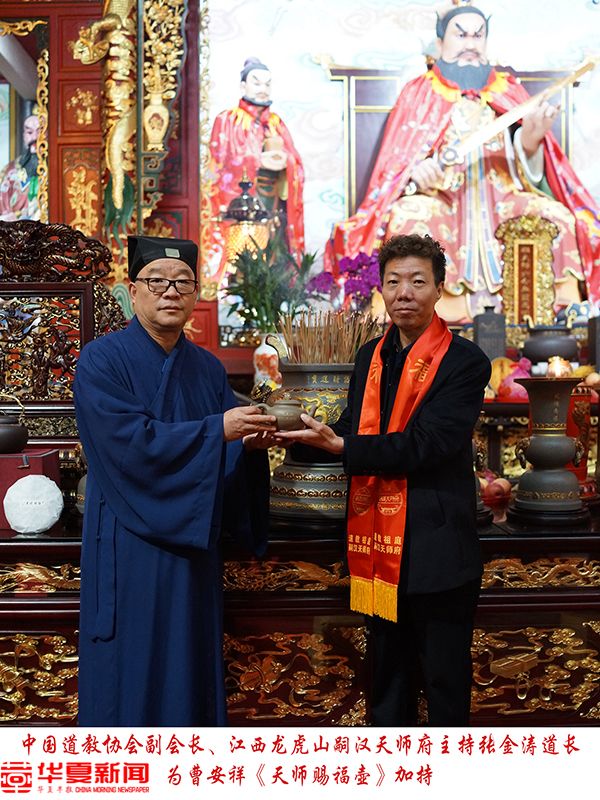 华夏早报江西讯(首席记者 董哲)11月18日,来自江苏宜兴的中国工艺美术大师曹安祥向江西龙虎山嗣汉天师府捐赠了“招财进宝”紫砂香炉。中国道教协会副会长、龙虎山嗣汉天师府主持张金涛道长接受捐赠,并为曹安祥精心制作的“天师赐福壶”加持。