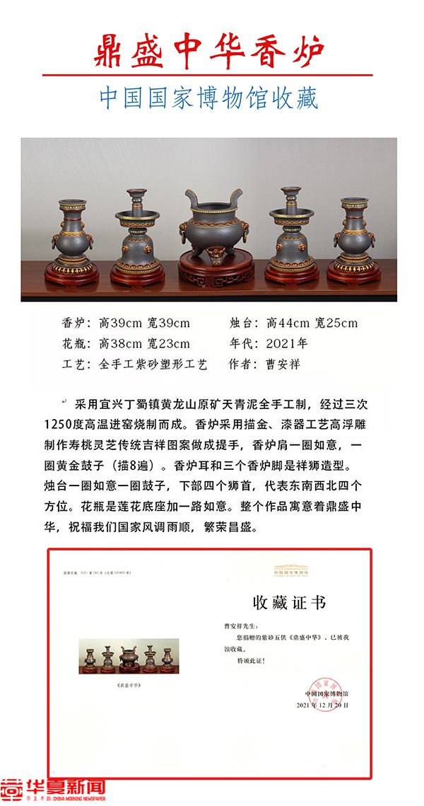 在宜兴,曹安祥不是最富有的紫砂艺术大师,甚至可以说是最穷的,因为这与他的佛缘有关。十几年来,他义务为国内外126座庙观无偿捐献紫砂香炉贡品128余套件,各种紫砂壶180余套件,估值2亿多元。他说:“我并不迷信,我只是尊重儒释道的文化,我捐赠的每一件作品都与受赠单位的文化息息相关,没有重复,只有传承和发扬。我要让旅游观光的人都看到紫砂文化的魅力!”这种文化自信的底气和豪气不仅仅来自于优秀传统文化的延续和传承,更多的是紫砂大师们那种孜孜以求的优秀文化创造力。