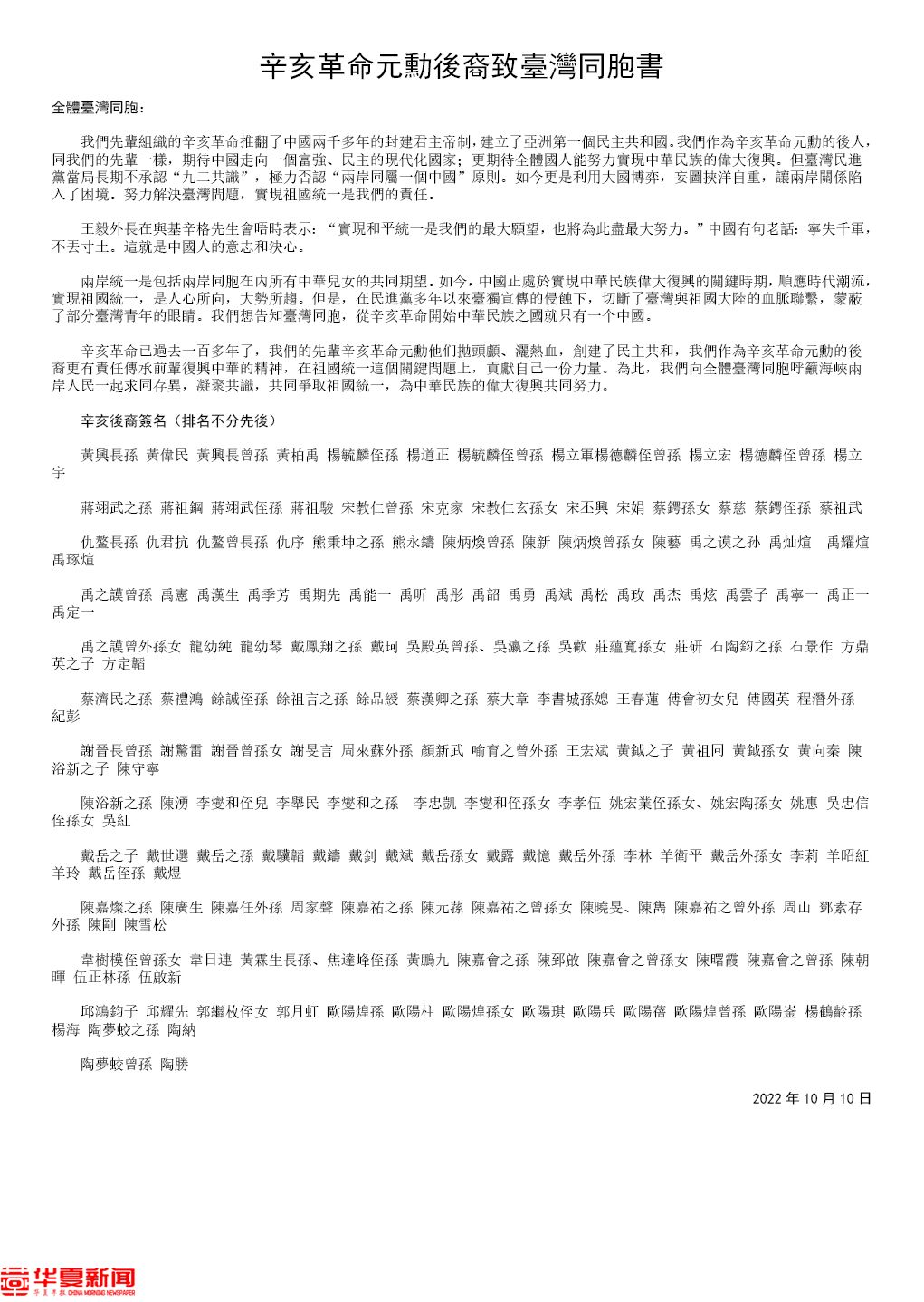 《辛亥革命元勋后裔致台湾同胞书》。