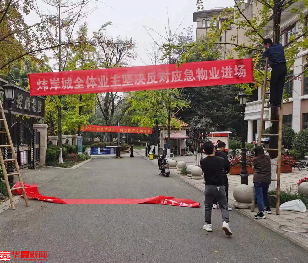 业主拉横幅反对应急物业进场。