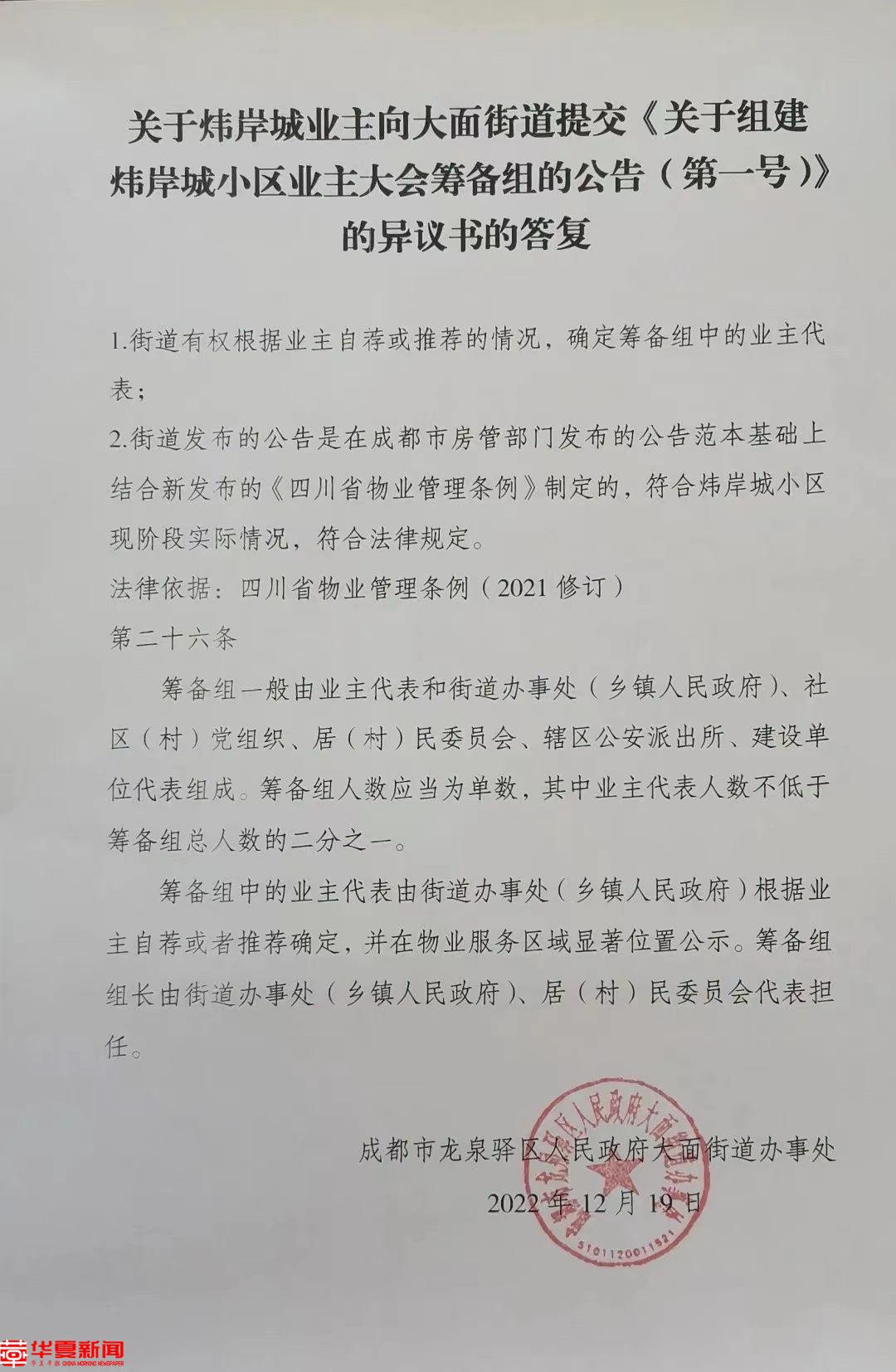 随后,华夏早报-灯塔新闻联系大面街道青台山社区居委会采访,工作人员告诉记者,关于炜岸城小区更换物业及成立业委会等相关问题,之前社区已经在小区发了通告,如果业主或者媒体还有什么疑问,可以咨询大面街道办事处。