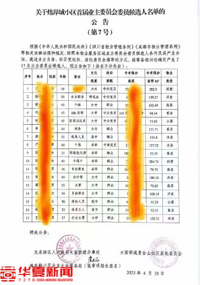据悉,诸多业主的强烈反应源自于2023年4月28日炜岸城小区业主大会筹备组联合大面街道办事处及青台山社区居委会发布的《关于炜岸城小区首届业主委员会委员候选人名单的公告》(即“7号公告”)。