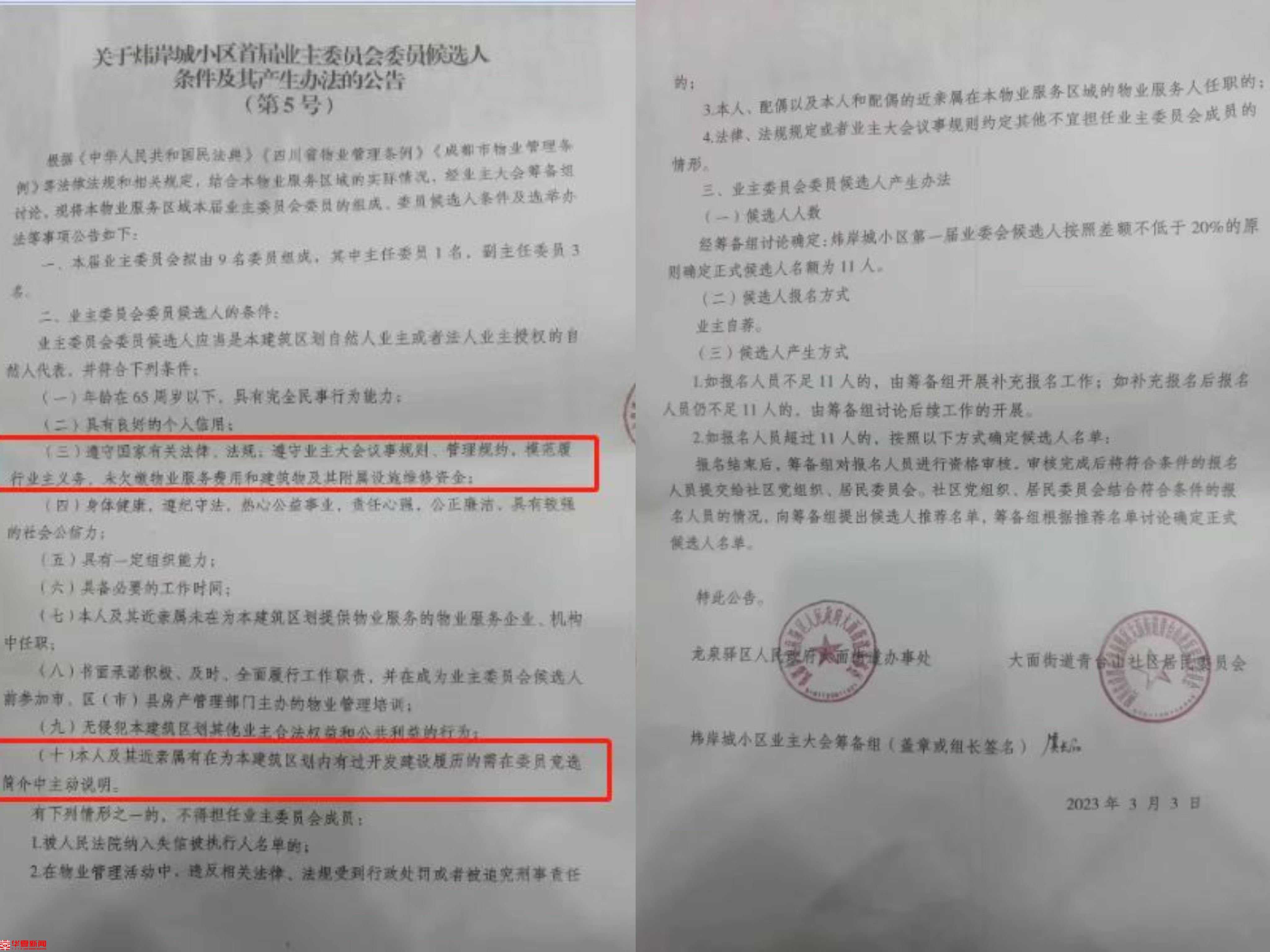 据业主反映,2023年3月3日,同样是大面街道、青台山社区和炜岸城小区业主大会筹备组联合发布的《关于炜岸城小区首届业主委员会委员候选人条件及其产生办法的公告》(即“5号公告”)中明确宣示“欠缴物业费用及附属设施维修资金”不符合参选业委会委员的资格。青台山社区在确定17名候选人名单并公示,受到质疑后,却宣称是否缴纳物业服务费不作为资格条件,“对自己发布的“5号公告”出尔反尔,严重违背了大面街道办回复已经备案的炜岸城《业主大会议事规则》、违反《四川省物业管理条例》的相关规定,但大面街道对此却持支持态度。”