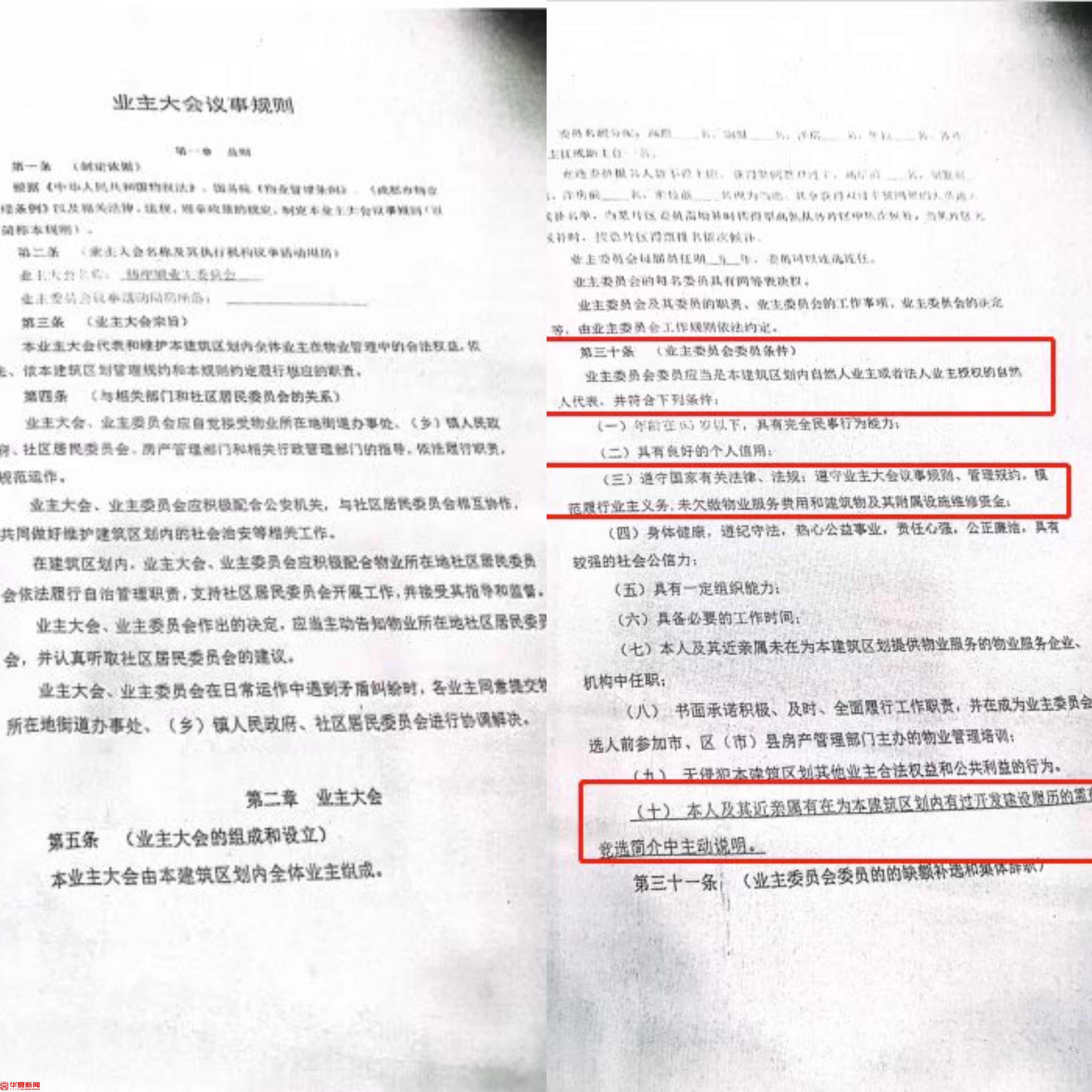 记者在大面街道办事处回复备案过的炜岸城小区《业主大会议事规则》看到,第三十条第一款也有对“业主委员会委员符合条件”的描述,其中第(三)项有明确约定:应“模范履行业主义务,未欠缴物业服务费用和建筑物及其附属设施维修资金。”第(九)项:“无侵犯本建筑区划其他业主合法权益和公共利益的行为。”