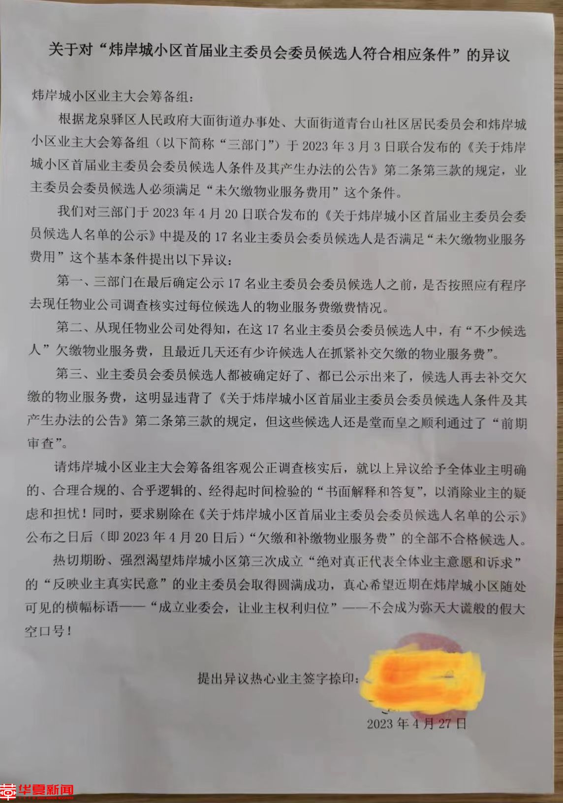 对此,一位热心业主在6月上旬曾向大面街道递交了一份书面申请书,认为炜岸城小区业主大会筹备组“以不实且不合法的理由不确认报名参选业委会委员的业主的候选人资格”、“将欠缴物业服务费用及附属设施维修资金的报名业主列为业主委员会委员候选人”,属于不合法侵害业主被选举权的违规违法行为,要求街道办责令筹备组立即予以纠正,撤销2023年4月28日公示的《关于炜岸城小区首届业主委员会委员候选人名单的公告》,撤销欠缴物业服务费用及维修资金的业主的首届业主委员会委员候选人资格,重新确定候选人人选。
