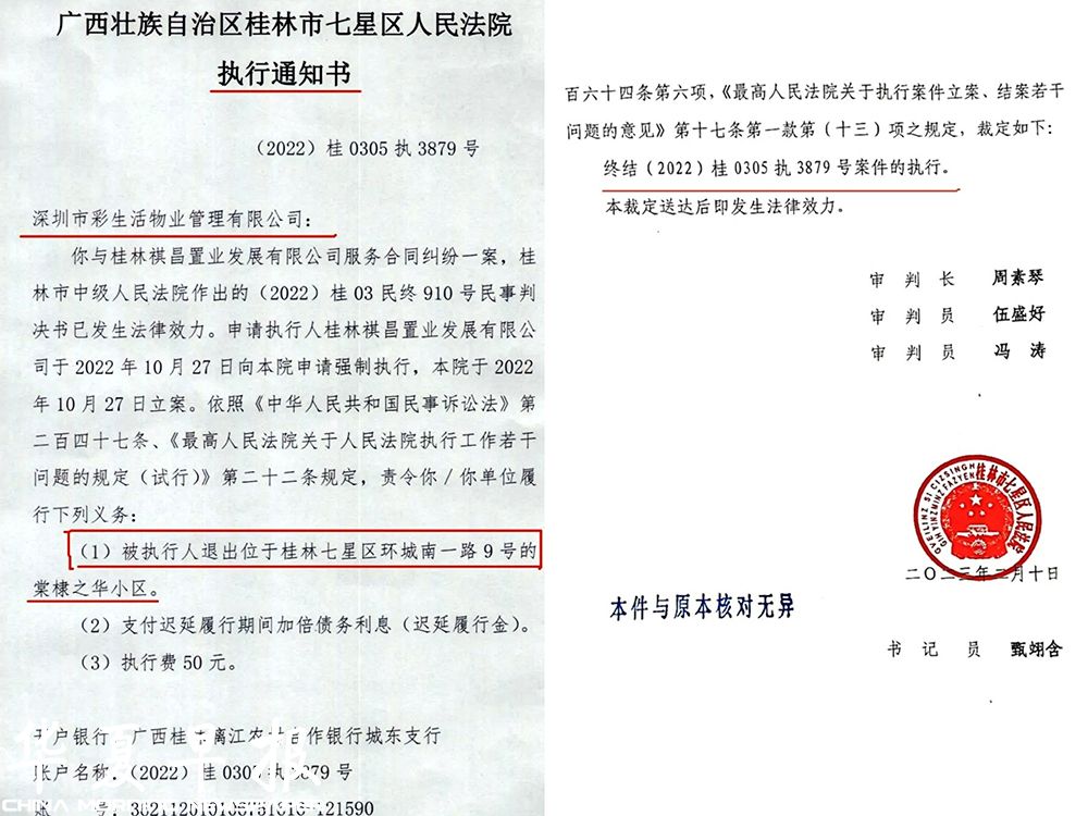 左图为 2022年10月27日,七星法院立案执行,要求彩生活公司履行判决、退出小区,但彩生活公司并未履行。右图为2023年2月10日,七星法院作出执行裁定,终结执行。