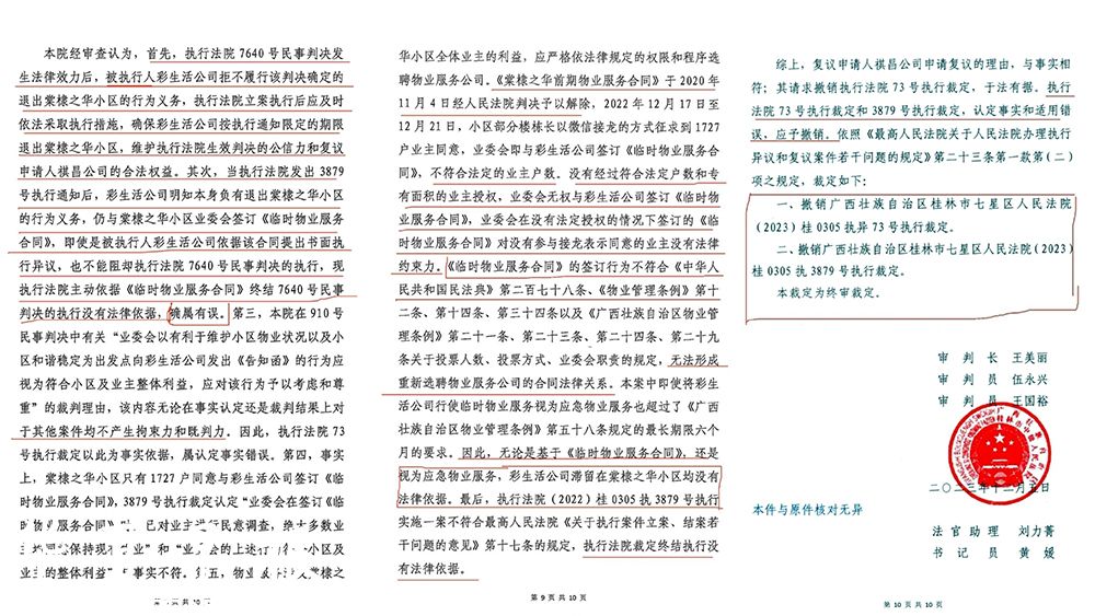 桂林中院认为,无论是基于《临时物业服务合同》还是视为应急物业服务,彩生活公司滞留在棠棣之华小区均无法律依据,七星法院裁定终结执行没有法律依据。认为七星法院两份裁定认定事实和适用错误,应予撤销。2023年12月5日,桂林中院作出终审裁定,撤销七星法院的两份执行裁定。