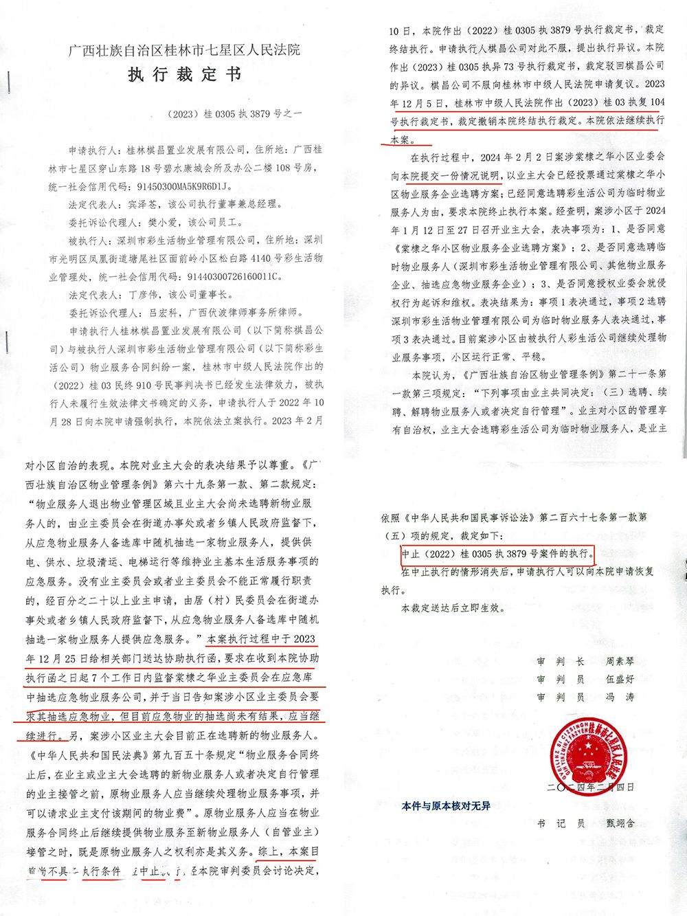 2月4日,七星法院又作出新的裁定,称桂林中院作出104号执行裁定,撤销该院终结执行裁定,该院依法继续执行此案。称在执行过程中,2月2日,案涉小区业委会向该院提交一份情况说明,以业主大会已经同意选聘彩生活公司为临时物业为由,要求该院终止执行。七星法院列举了一堆理由,认为此案目前尚不具备执行条件,应中止执行,于是裁定中止3879号案件的执行。