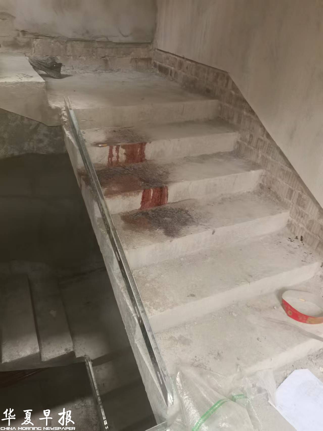 工人从四楼坠落,还留有一滩血迹。