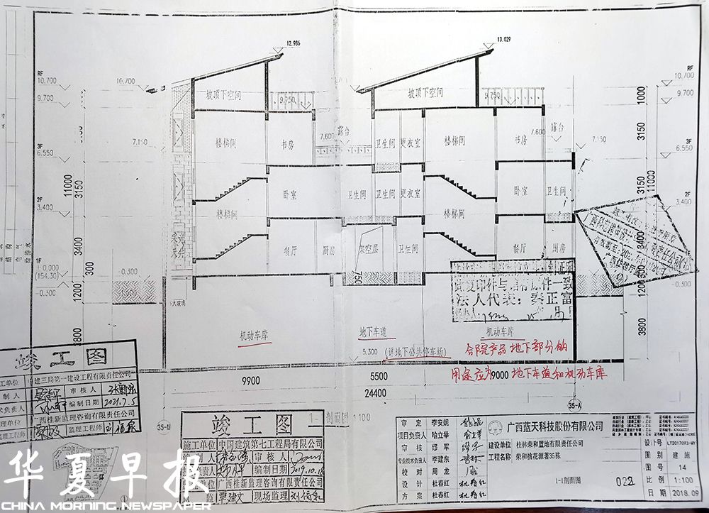 退房维权无门后,杨先生去住建部门调取报建图纸后,发现荣和桃花源著小区内有一个更庞大、更触目惊心的违法黑幕。杨先生发现,开发商在销售过程中,大肆宣传买三层得五层的诱人口号,合院样板房也是将停车场改成负一楼和负二楼住宅,售楼部的宣传图纸上,也标注着五层。他还发现开发商未按工程设计图纸施工,公然将规划中本属于全体业主共有的地下公共停车场,建墙分隔,供业主像样板房一样改造成住宅。这种操作完全未按经审批的法定工程设计图纸施工,属于典型的违法建设。掌握确凿证据后,杨先生实名向桂林市自然资源局进行了实名举报,称该小区违建面积上千平方米。请求立案查处,将合院产品样板间及他自己房屋在内的十几户合院违建房屋予以拆除,并严格追究开发商的责任。