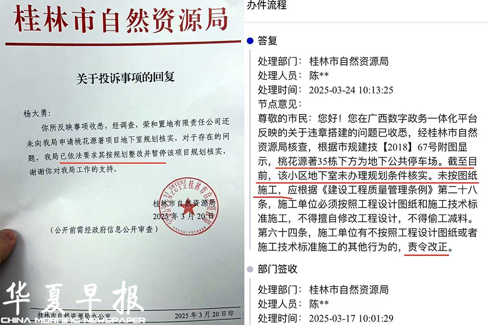 今年3月20日,桂林市自然资源局书面回复,称杨先生反映事项收悉,经调查,荣和公司还未向该局申请桃花源著项目地下室规划核实,对于存在的问题,该局已依法要求其按规划整改并暂停该项目规划核实。