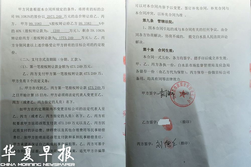 记者在刘德仁和袁保成签订的《白水县烽源煤业有限责任公司股权转让合同》中看到,转让方和受让方在多处约定,如果转让方在约定的时间内不予配合变更登记股权转让等手续,承担返还全部股权转让款的义务,要自行承担一切不利法律后果,包括刑事责任。