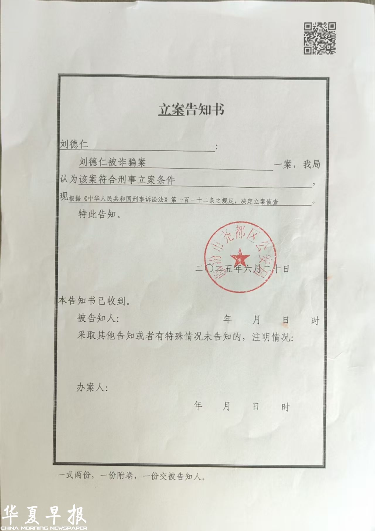 据悉,2025年6月17日,刘德仁已向其现居住地的山西临汾市尧都区公安局报案。6月20日,临汾市尧都区公安局认为该案符合刑事立案条件,决定以诈骗案立案侦查。目前,该案正在进一步调查中。