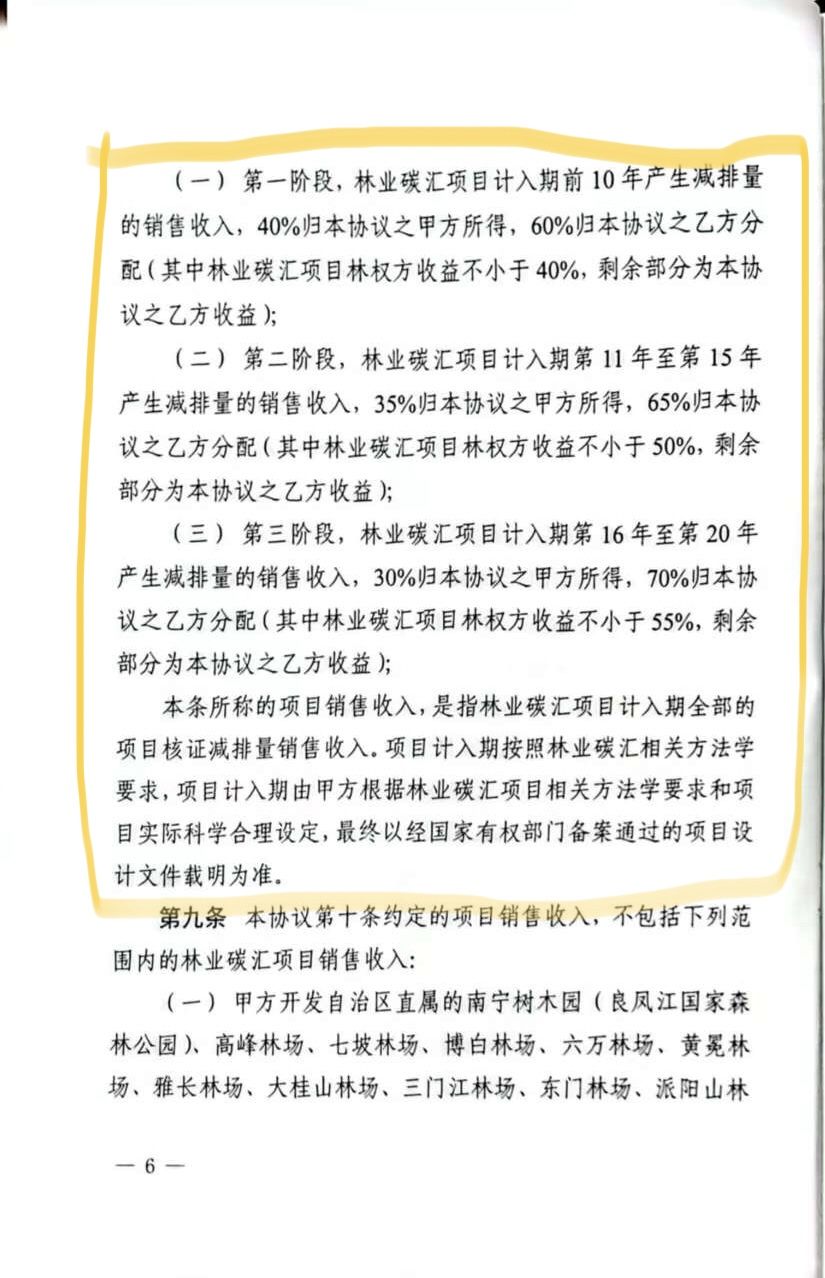 关于分成比例,协议约定“第一阶段,林业碳汇项目计入期前10年产生减排量的销售收入,40归协议之甲方所得,60%归本协议之乙方分配(其中林业碳汇项目林权方收益不小于40%,剩余部分为本协议之乙方收益);”、“第二阶段,林业碳汇项目计入期第11年至第15年产生减排量的销售收入,35%归协议之甲方所得,65%归本协议之乙方分配(其中林业碳汇项目林权方收益不小于50%,剩余部分为本协议之乙方收益);”、“第三阶段,林业碳汇项目计入期第16年至第20年产生减排量的销售收入,30%归协议之甲方所得,70%归本协议之乙方分配(其中林业碳汇项目林权方收益不小于55%,剩余部分为本协议之乙方收益)。”