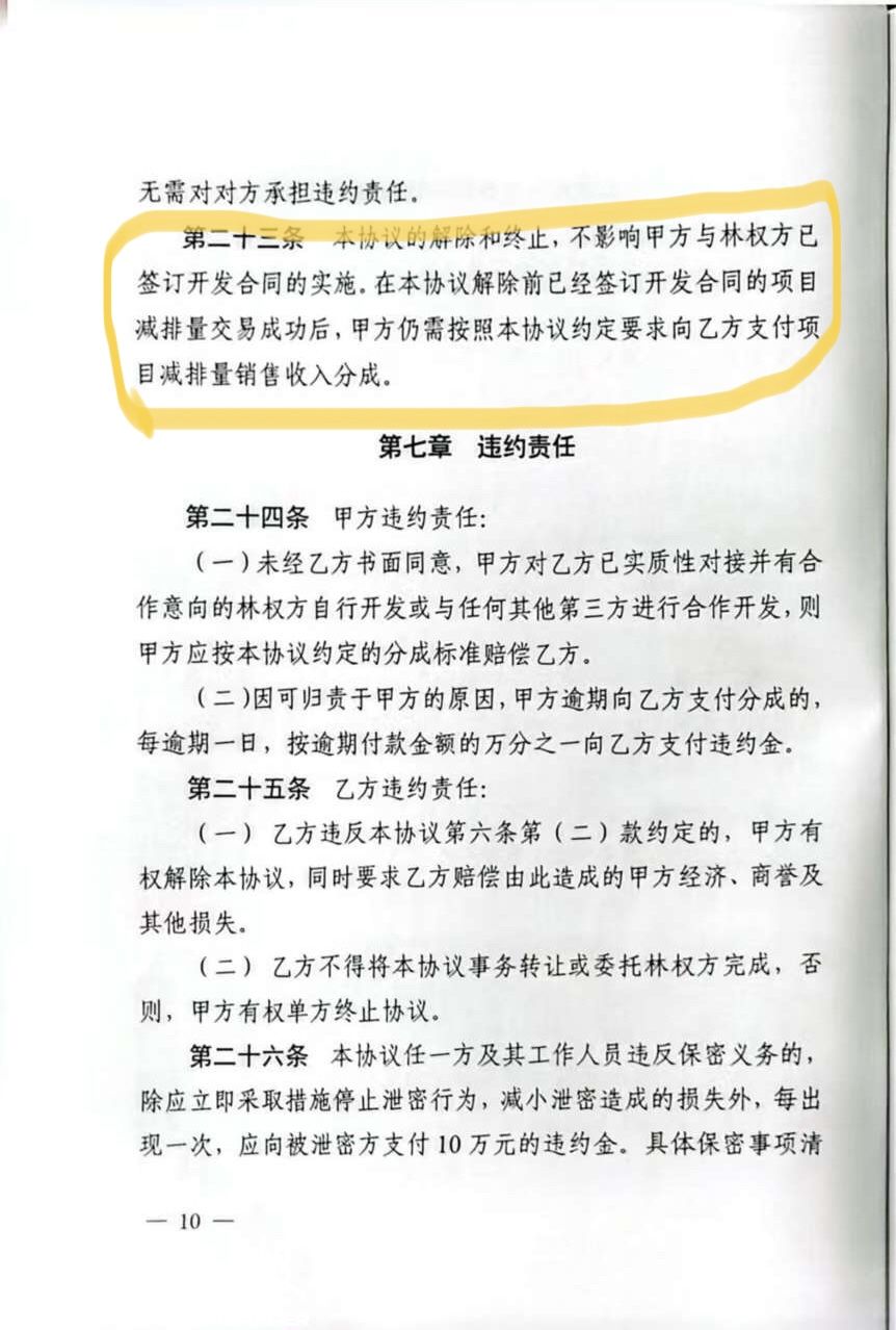 而在“协议的解除和终止”上,双方则明确约定“本协议的解除和终止,不影响甲方与林权方已签订开发合同的实施。在本协议解除前已经签订开发合同的项目减排量交易成功后,甲方仍需按照本协议约定要求向乙方支付项目减排量销售收入分成。”