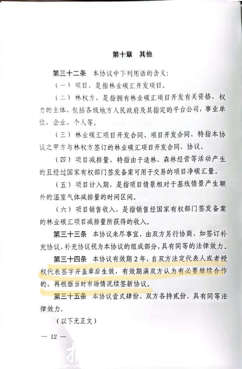 记者看到,2023年2月7日,董卫以自己任法定代表人的广西贺州市卫佳林业开发有限公司(乙方)与广西碳中和科技发展有限公司(甲方)签订了《林业碳汇项目开发合作协议》。协议约定:乙方负责整合贺州市森林资源与甲方开展林业碳汇开发合作。甲方与林权方签订开发合同后,甲乙双方必需根据本协议内容,就每个开发合同另行签订具体项目的合作开发协议,并对在协议中未能明确的事项进行明确。