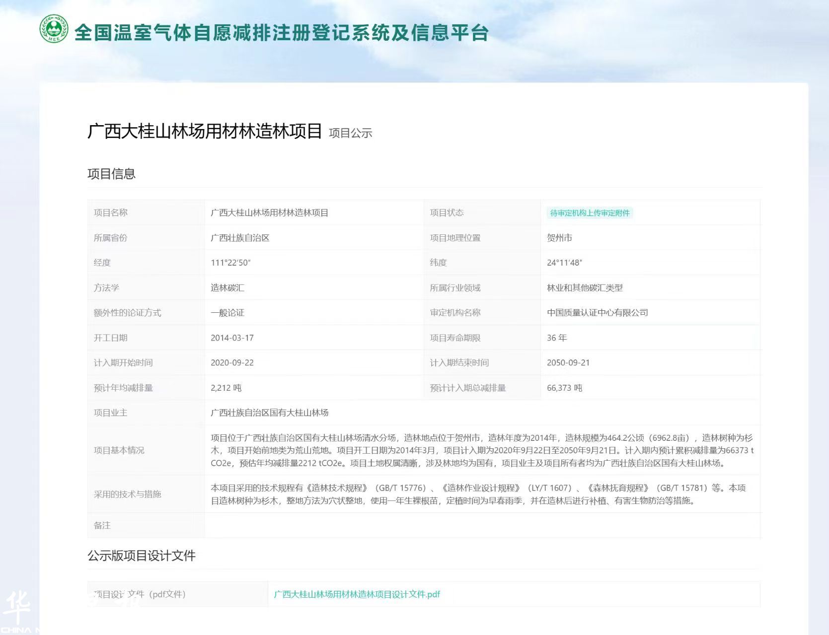 据董卫介绍,广西碳中和科技发展有限公司当时分管业务的负责人跟他们讲,一年开发,有五年的收益。如2022年开发,碳汇项目有往前追朔的碳排放指标,2020年9月20日之后的林业开发碳江项目核算减排可以从2020年9月20日开始,要求林地种植时间是2013年之后种植的林地,这样他们就可以有五年的收益。