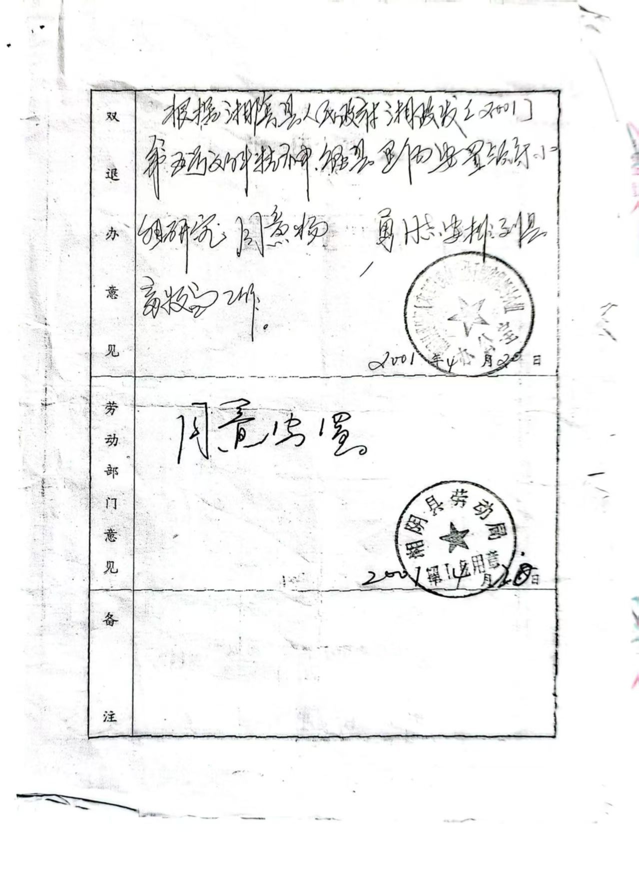 由湘阴县“双退”领导小组办公室和县劳动局制发的《退伍军人安置表》显示,根据湘阴县人民政府湘政发【2001】第5号文件精神,经县退伍安置领导小组研究,同意杨勇同志安排到县畜牧局工作,上面盖有上述两家单位的公章,落款日期为2001年4月20日。