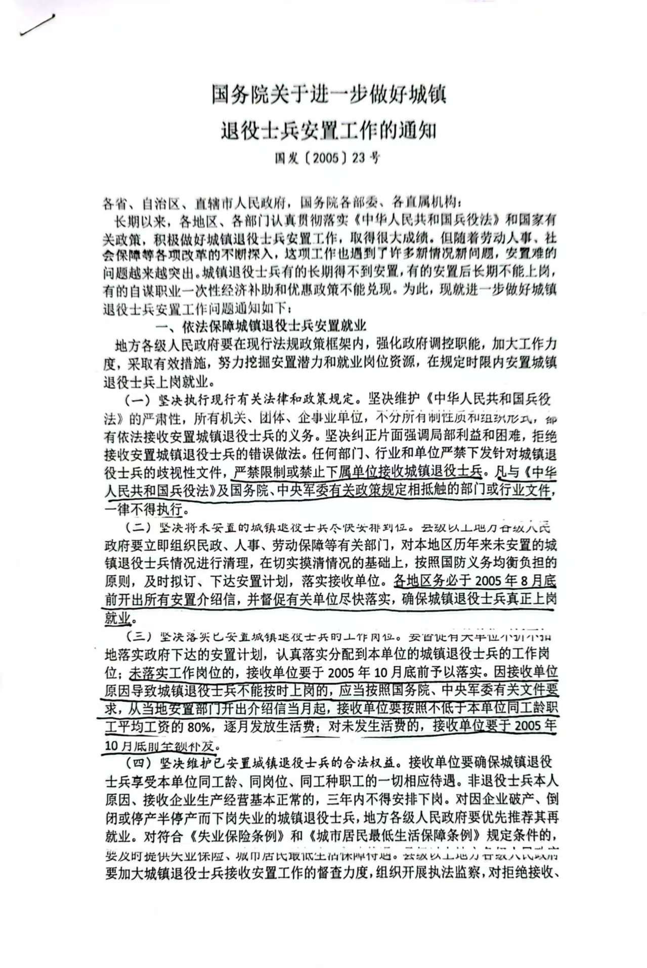 2005年国务院关于做好城镇退役士兵安置工作的要求。