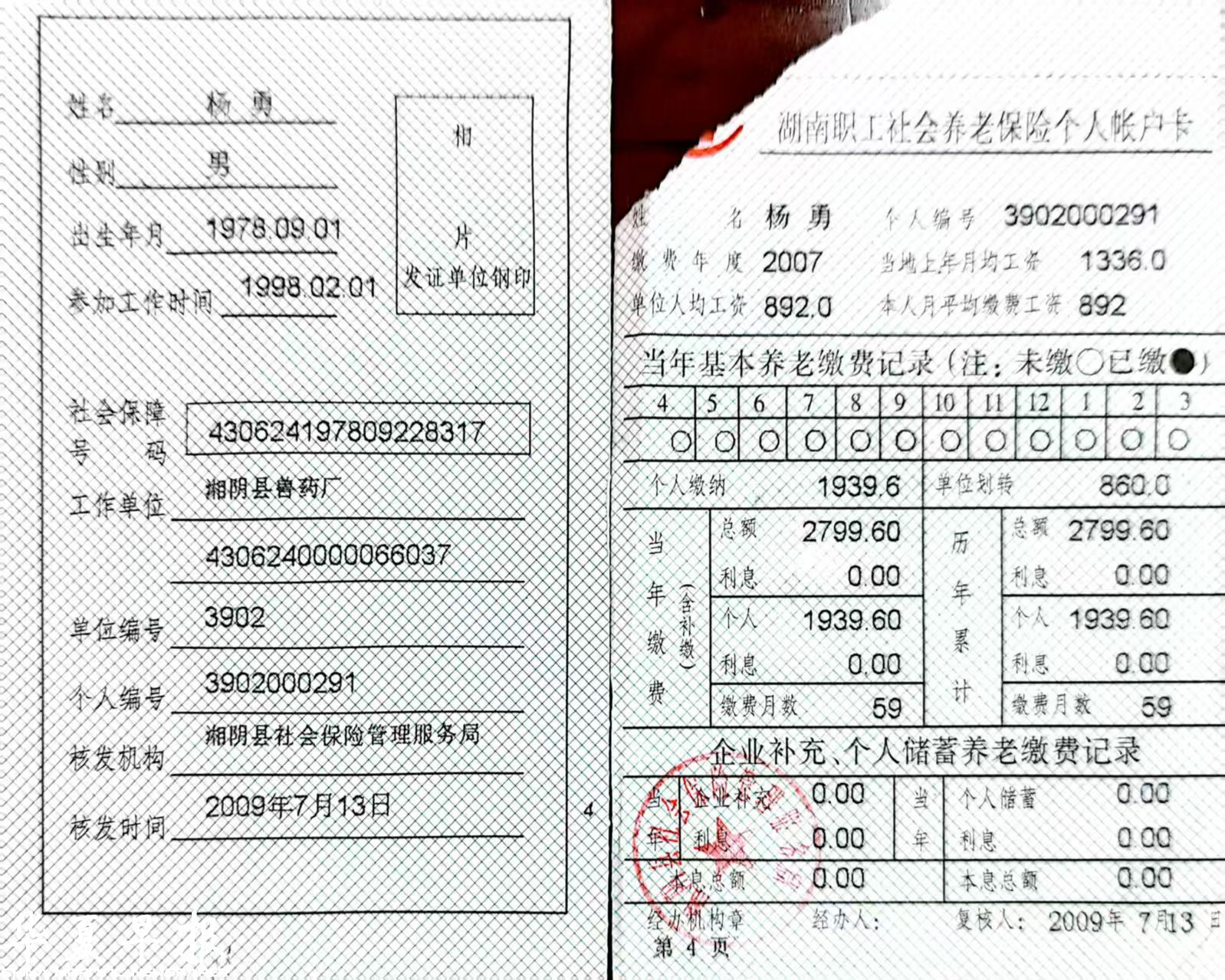 记者在杨勇提供的社保证上看到,上面的姓名是“杨勇”,贴相片处没有相片,工作单位是“湘阴县兽药厂”,核发时间是2009年7月13日。